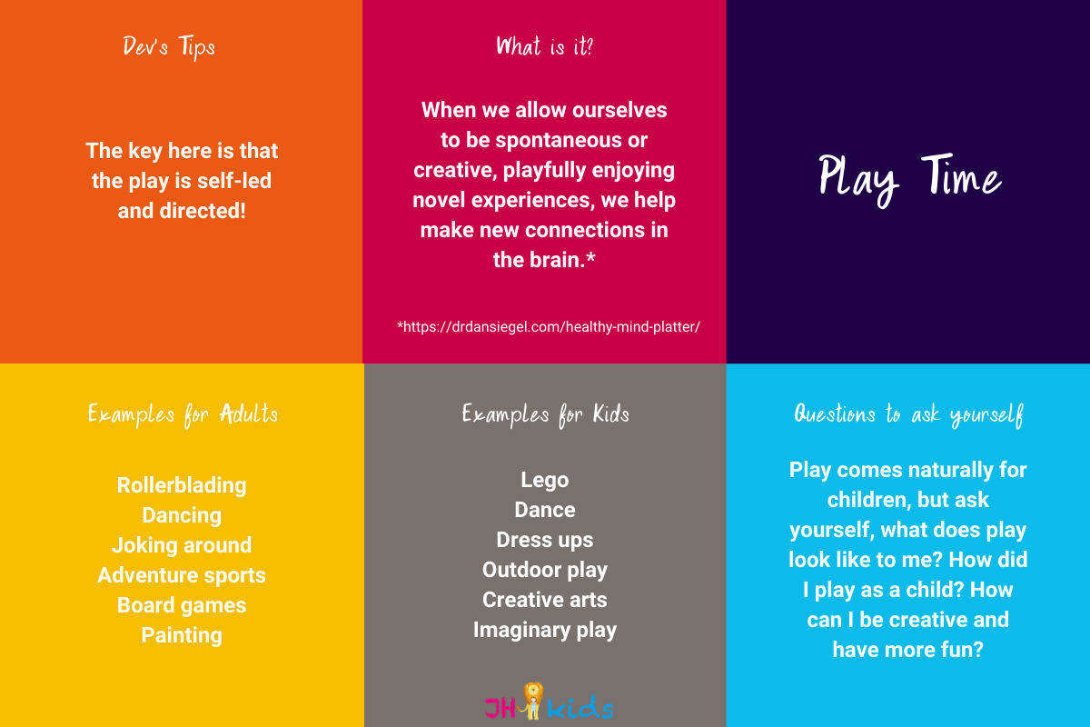 The creators of the Healthy Mind Platter call this “the joy of experimenting with life”. According to the American Academy of Pediatrics “free and unstructured play is…essential for helping children reach important social, emotional and cognitive developmental milestones…and helps them manage stress and become resilient”.