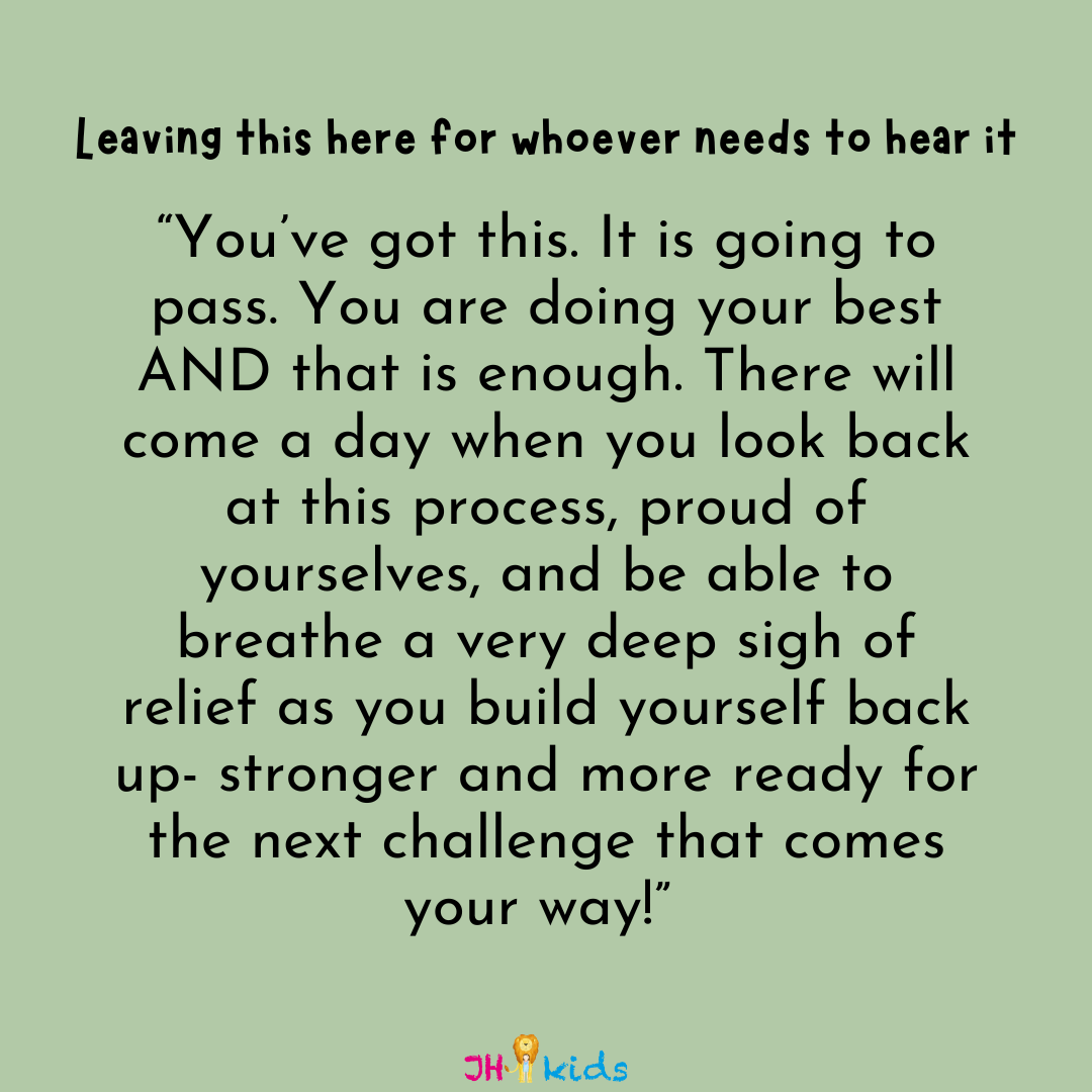 Learn to be present. When it is hard, it is soooo hard. But when it is good, we want to take it in with every sense to make a positive imprint on our memory too. Being present can be pausing to acknowledge “This is realllllyyy hard right now. I feel the tightness in my jaw and my shoulders, and I can almost feel the hot air rising ready to explode”, but it can also be “This is so wonderful, I’m going to take it all in. Ahhh the sweet sound of laughter, the smell of sweaty baby hair, the weight of the hug, the mess that represents creativity etc”.