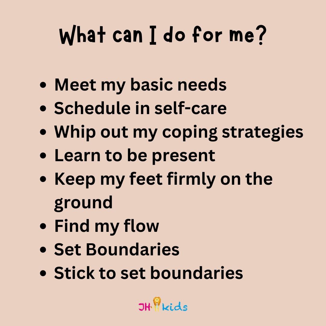 First things first. Are you meeting your basic needs? Healthy food, sleep, exercise (if you haven't heard about the Healthy Mind Platter- now is the time). If your kids come home from school and you haven’t seen the sunlight, or had a glass of water, or proper meals then you won’t be in an optimal state to be able to respond to anyone else’s big feelings or dysregulation.