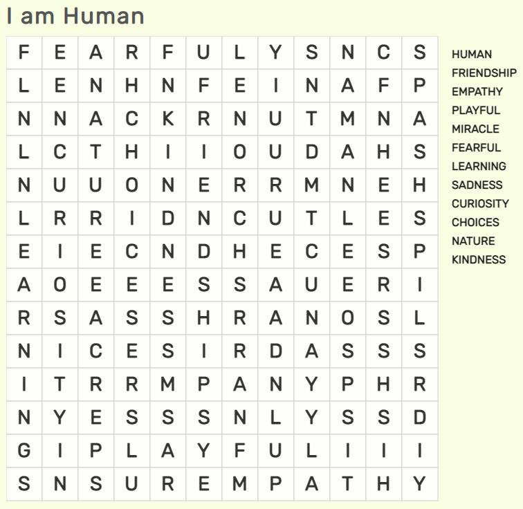 Activity: I am Human wordsearch. Click here to play online. Click here to download a printable version.